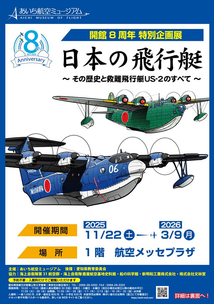 あいち航空ミュージアムでは、開館8周年を記念して、特別企画展 「日本の飛行艇~その歴史と救難飛行艇US-2のすべて~」を開催します。企画展では航空ジャーナリスト会員の